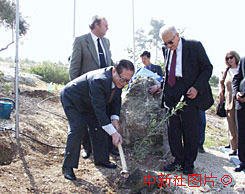 中國國家主席江澤民在以色列總統魏茨曼的陪同下,四月十六日在以色列總統森林園植下了一棵橄欖樹。 中新社記者 彭偉祥 攝