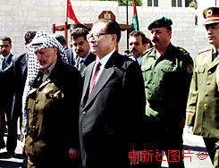 江澤民主席十五日抵達伯利恒對巴勒斯坦進行國事訪問,巴勒斯坦總統阿拉法特舉行歡迎儀式。中新社記者:彭偉祥