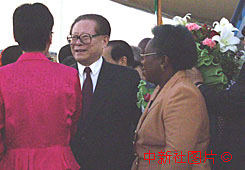 中國國家主席江澤民4月24日傍晚(當地時間)抵達約翰內斯堡,受到南非外長和當地華人的熱烈歡迎。中新社記者 彭偉祥 攝