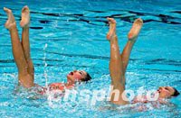 澳門一對美少女十一月二十二日在廣州九運會花樣游泳比賽中,伴隨《梁祝》的優美旋律,在碧波中以純情之藝演繹中國古代著名愛情傳奇,贏得一片掌聲。中新社記者 賈國榮 攝