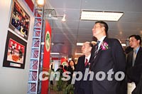 澳門特區政府行政長官何厚鏵與全國政協副主席馬萬琪,七日在北京華潤大廈參觀《紀念澳門基本法頒布九周年圖片展》。中新社記者 史利 攝