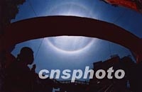圖:福州突現(xiàn)日暈外“暈”奇觀 2002年04月14日 19:08 ![]() 十三日上午福州上空出現(xiàn)一道瑰麗的奇觀:在燦爛的太陽(yáng)周圍有一個(gè)耀眼的光環(huán)。半小時(shí)過(guò)后,出現(xiàn)一個(gè)相對(duì)顏色淺一些的光環(huán)(如圖)。十幾分鐘后,光環(huán)漸漸淡去,這種美麗奇觀前后持續(xù)了約一個(gè)多小時(shí),讓觀者嘖嘖稱奇。據(jù)省氣象臺(tái)說(shuō);這種現(xiàn)象在氣象學(xué)中稱“日暈”,對(duì)天氣沒(méi)有什么影響。中新社圖 楊婀娜 攝