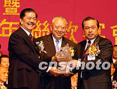 七月三日,香港特首董建華向香港廣東社團總會頒贈紀念品。中新社圖 潘索菲 攝