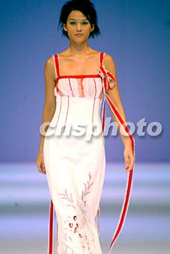 圖:香港設計師鄭兆良的“仿旗袍天女下凡裝” 2002年07月12日 10:09 ![]() “2003香港春夏時裝節”7月10日晚舉行香港十位頂尖設計師作品展示,模特展示著名設計師鄭兆良設計的一款仿旗袍低胸配紅長飄帶女裙,恍如天女下凡。任晨鳴 攝