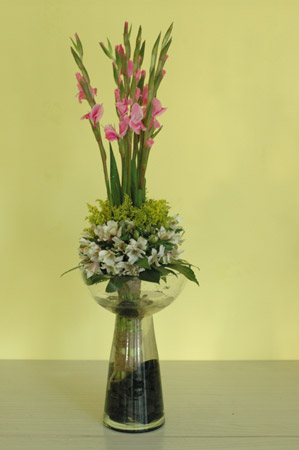 花材:劍蘭、水仙百合、黃鶯、八角金盤、燈臺(tái)