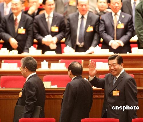 3月14日上午,全國政協十一屆一次會議在北京人民大會堂閉幕,全國政協主席賈慶林在主席臺向委員們揮手致意。中新社發 盛佳鵬 攝