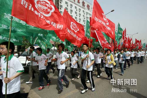 “開展全民健身,構建和諧社會”當地的政府官員、部隊戰士、學校師生、工人、農民、街道居民、企業員工行進在長跑隊伍中。漫天紅旗在舞動,震天的鑼鼓在敲響,奧運離人們的也越來越近。