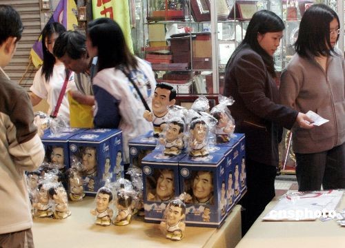 大批支持者在馬蕭競(jìng)選總部前集會(huì)歡慶。圖為集會(huì)現(xiàn)場(chǎng)不時(shí)有人購(gòu)買馬英九公仔。