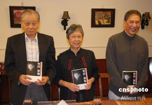 九月三十日下午,女作家陳若曦(中)在臺北舉辦新著《堅持·無悔——陳若曦七十自述》出版發布會。著名作家白先勇(右)前來向當年臺大老同學祝賀。陳若曦一九三八年生于臺北縣中和,臺大外文系畢業后留學美國,獲約翰霍普金斯大學寫作系碩士。一九六六年與丈夫回到中國大陸,一九七三年到香港居住,先后移居加拿大、美國,近年定居臺北。其作品曾被譯為英、德、日、法、挪威等文字。中新社發 耿軍 攝