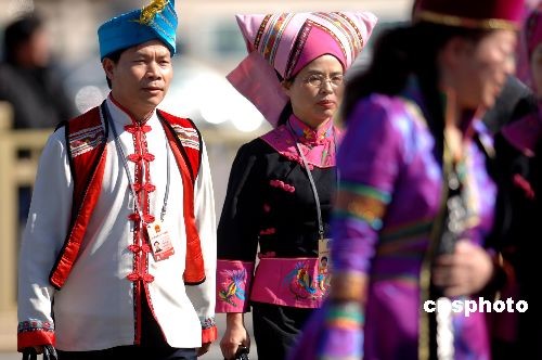 三月三日下午,少數民族翻譯人員走進會場進行大會同聲翻譯工作。當日下午三時,全國政協十一屆一次會議在北京人民大會堂隆重開幕。中新社發 王東明 攝