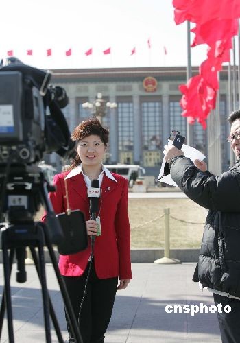 三月三日下午,全國政協十一屆一次會議在北京人民大會堂開幕,地方電視媒體記者盛裝進行現場報道,關注大會議程。中新社發 毛建軍 攝
