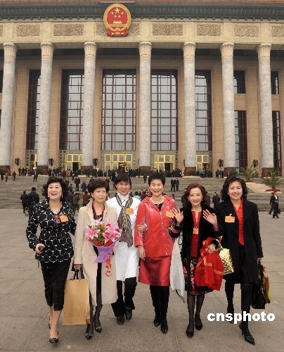 三月八日,國際勞動婦女節,全國政協女委員參加完大會笑容燦爛走出北京人民大會堂。中新社發 廖攀 攝