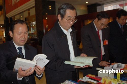 3月8日下午,參加完十一屆全國人大一次會議第二次全體會議的全國人大代表、廣西壯族自治區主席馬飚(左二)等人,在廣西大廈內的書攤前選購圖書,會議間隙學習“充電”。中新社發 劉萬強 攝
