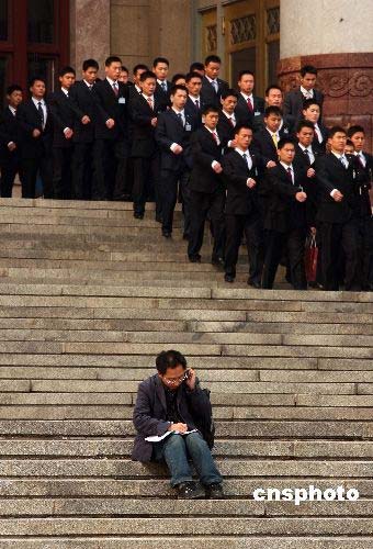 三月八日上午,全國政協十一屆一次會議第二次全體會議在北京人民大會堂舉行,十四位政協委員圍繞經濟建設和社會建設等問題作大會發言。會后,一名忙碌的記者坐在臺階上與列隊而出的兩會服務人員相映成趣。中新社發 盛佳鵬 攝