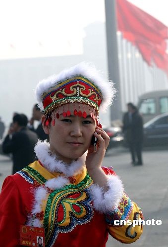 三月十日,十一屆全國人大一次會議在北京舉行第三次全體大會,中國人口最少的民族之一赫哲族全國人大代表劉蕾邊打手機邊走向會場。赫哲族生活在中國東北的黑龍江省,人口只有4千多。劉蕾年僅24歲,屬于“80后”,是唯一的赫哲族全國人大代表。中新社發(fā) 任海霞 攝
