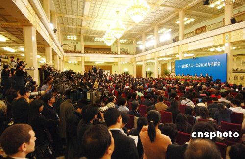 3月18日上午,十一屆全國人大一次會議在北京人民大會堂閉幕,國務院總理溫家寶于會后率李克強、回良玉、張德江、王岐山四位副總理會見中外記者。中外媒體云集總理記者會。中新社發 王東明 攝