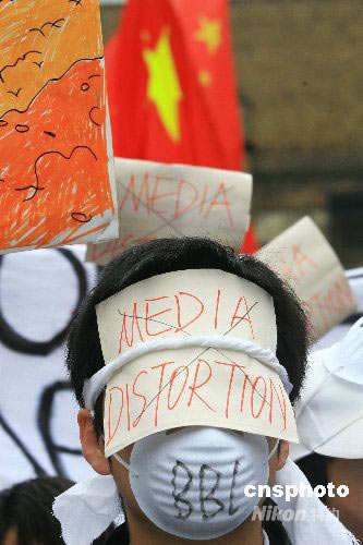 當(dāng)?shù)貢r間19日,在英國學(xué)習(xí)、工作和定居的華人約2000多人在倫敦舉行靜默集會,抗議包括英國廣播公司(BBC)在內(nèi)的西方媒體對中國所做的不公正的、片面的報道。圖為一名示威者戴著口罩,抗議媒體歪曲報道。中新社發(fā) 李鵬 攝