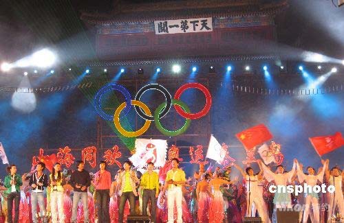 圖:秦皇島民眾山海關(guān)前歡慶奧運倒計時一百天