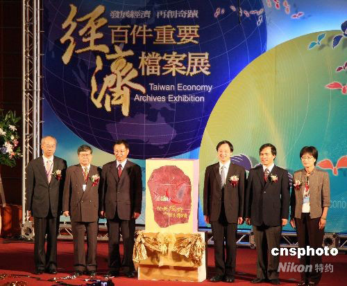 十月五日,《百件經濟重要檔案展》在臺北中山南路二十號的圖書館開幕。展出的一百一十一則檔案,是從近六百萬件檔案中嚴選、再經六位專家學者審定才展示給觀眾的。圖為展覽開幕式。中新社發 耿軍 攝