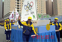 澳門回歸一周年到來之際,大豐銀行職工推著有支持北京申辦奧運標志的彩車在街頭游行。中新社傳真 宗金柱 攝
