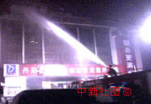 消防人員趕到河南洛陽發生重大火災的商廈前,奮力噴水救人。中新社圖