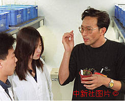 全國人大代表,北京大學(xué)副校長陳章良教授(右一)十三日在實(shí)驗(yàn)室與科研人員開展人類第一次破譯全部DNA密碼的高等植物擬南芥的研究。作者:陳勇