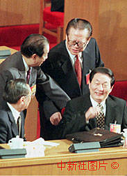 國家主席江澤民(右二)、總理朱镕基(右一)、副總理李嵐清(左一)、錢其琛(左二)在九屆全國人大三次會議閉幕會上交談。作者:王麗南
