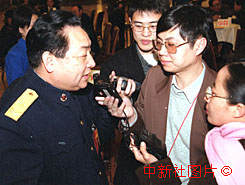 全國人大解放軍代表、海軍少將、湛江海軍基地政治委員傅渤海十五日在九屆全國人大三次會議閉幕會前,就海峽兩岸關系問題回答中外記者提問。作者:陳勇