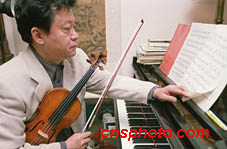 中國國家交響樂團著名小提琴演奏家盛中國,近日將開始新千年全國巡回演出。圖為盛中國在家中研究樂譜。中新社記者 張勤 攝