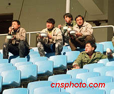 正在為北京申辦2008年奧運會而進行體育場館改造的工人們,為了爭取時間,頂著冬天的寒風在工地上午餐。中新社記者 李剛 攝