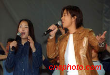 歌星田震(左)二月二十日在香港舉行的“向老師致敬2001”活動上演唱。中新社傳真 任海霞攝