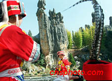 春天到云南石林旅游的游客,穿上彝族服裝在阿詩(shī)瑪形象石前拍攝美好的瞬間。中新社記者 滿會(huì)喬 攝