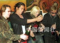 日本紅星反町隆史(圖左二)6日抵港,并立即與香港記者會面。為預(yù)祝他個唱演出成功先開香檳,反町隆史將于7日在香港舉行首次個人演唱會。中新社傳真鄧慶樂攝