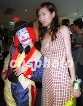 影視紅星楊恭如25日出席頒贈「美之標本」體態大獎,與會場內表演魔術的小丑合照。中新社圖 鄧慶樂 攝