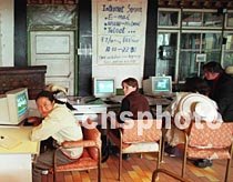 開設在拉薩八廓街咖啡店的“網吧”,很受外國游客的歡迎,每天有二十位左右客到這里上因特網。這個“網吧”是西藏第一家“網吧”,開張已有一年多時間。中新社圖 趙偉 攝