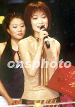 中國蒙古族女歌手斯琴格日樂,日前在《中國流行歌曲榜》年度頒獎晚會上獲得最佳新人獎。圖為她在領獎臺上向歌迷致意。中新社記者 錢興強 攝
