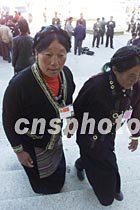西藏自治區七屆人大四次會議13日拉薩舉行,出席會議的藏族婦女代表手挽手步入西藏人民大會堂。中新社記者 滿會喬 攝