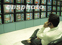 臺灣股市21日跌破五千點關口,股民忙著用手機致電經(jīng)紀落盤買賣.中新社臺北傳真 王順 攝