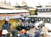 一些修復布達拉宮墻體的藏族工人在輝煌的金頂旁小憩。西藏拉薩布達拉宮金頂五月開始進行局部整修。中新社記者 滿會喬 攝