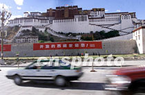 拉薩布達拉宮前新掛起紅色條幅,慶祝西藏和平解放五十周年,西藏人以開放的心態慶祝自己的節日。中新社記者 滿會喬 攝