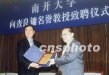 圖文:金庸受聘為南開大學文學院名譽教授 2001年5月28日 10:42 ![]() 著名武俠小說家金庸先生五月二十八日受聘為南開大學名譽教授。圖為南開大學校長侯自新(左)向金庸先生(右)頒發聘書。中新社記者 孫志民 攝