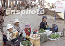西藏拉薩街頭小販在叫賣野菜,新鮮的野菜為拉薩市民的餐桌更增色彩。中新社記者 滿會喬 攝