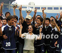 中新網(wǎng)西安6月6日消息:(記者呂振亞)古城西安熱情,古城民眾好客。“萬里行”車隊在西安逗留第三天,我們已溶入這個千年古都,我們已與古城民眾心心相印。 萬名學子齊聲呼喊的壯觀場面歷歷在目,世紀老人熱切期盼的凝重目光烙印在心。鳳凰衛(wèi)視把一幅幅感人的畫面?zhèn)飨蚴澜纾S行記者把一段段動人的故事獻給讀者。 我們就要離開西安繼續(xù)西進,沿著“絲綢之路”,開始遠征莫斯科的“申奧之旅”。今天,我們來到陜西國力足球隊訓練場,與隊員們相約,與球迷們相聚,與西安民眾話別。 下午四點,鳳凰衛(wèi)視邀請的“明星隊”一出現(xiàn)在訓練場,看臺上的球迷們掌聲四起。由香港影星成奎安和內(nèi)地歌手高崎組成的“明星隊”雖然勢單力薄,國力隊球員仍與之展開了傳球“對抗”,鳳凰主持人曾靜漪小姐也上場助陣,四處“奔波”,“忙”得不可開交,看臺上的球迷不時呼喊助威。 陜西國力隊負責人為我們的到來破了規(guī),特準正在指導訓練的外籍教練卡洛斯接受了我們的采訪。這位教練對“申奧萬里行”活動已有所耳聞,他微笑著一一回答了我們的提問:“你對北京申奧的前景有何看法?”“中國體育發(fā)展很快,北京已完全具備舉辦奧運會的條件,我很希望看到北京能主辦奧運會,祝北京成功!”教練的話還沒有經(jīng)過翻譯,但那種肯定的語調(diào)已讓我們明白。 “比賽”結(jié)束了,看臺上的球迷余興未盡,不時沖著成奎安喊:“大傻、成哥”。“成大哥”揮動著雙手,走近看臺,當起了“指揮”。他領著球迷們齊聲高喊:“北京好運,申奧成功!” 一時,體育場內(nèi)沸騰了,球迷們向我們不停揮動著雙手,高喊著:“萬里申奧,我們與你們同行!”(完) |