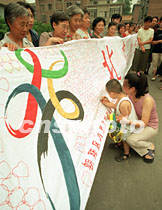 兩歲半小朋友王一山七日在媽媽的幫助下,在20米長繪有2008顆心和“申辦奧運,北京好運”的橫幅上簽名。橫幅由北京市八里莊街道延靜里的居民親手制作,表達人們熱切的申奧心愿。中新社圖 史利 攝
