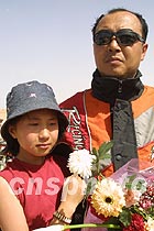 二位英雄早早等候在關外,與車隊一起為北京申奧助威。他們是剛剛從珠穆朗瑪峰挑戰極限載譽歸來的楊華和張長順。五月二十六日,楊張二人駕駛國產摩托車從嘉峪關出發,六月一日攀登珠峰至大本營,創造了駕車登山五千八百米的吉尼斯世界紀錄。恰逢申奧車隊抵達這里,當地政府特意在關外舉行盛大歡迎儀式,既為二位英雄慶功,又為北京申奧助威。