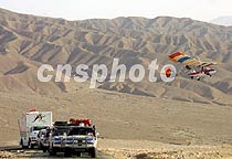 六月十一日下午四時許,“萬里行”申奧鳳凰車隊抵達嘉峪關,圖為車隊行進在戈壁灘上,飛機正在航拍車隊在穿躍“天下第一雄關”時的情景。魏孝明 攝
