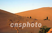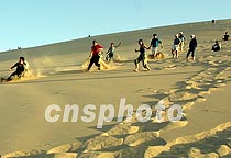 中新網(wǎng)敦煌6月12日消息:(記者呂振亞)西出嘉峪關(guān),“北京——莫斯科申奧萬里行”鳳凰車隊今天中午在敦煌安營扎寨。 北京時間下午七時,敦煌上空的太陽依然“高高在上”,車隊同仁頭頂烈日,驅(qū)車來到鳴沙山下月牙泉邊。 鳳凰衛(wèi)視主持人曾靜漪一聲“令”下,全體將士齊聲應(yīng)答:“挑戰(zhàn)極限,喲!”一時,將士們朝沙山上沖去,身后留下深深的足跡。大家開心地歡呼,隨隊的北京電信衛(wèi)星通訊車的小伙子還在沙坡上踩出了“五環(huán)旗”,隨行記者把這一精彩瞬間永恒珍藏,并將隨著我們一路遠(yuǎn)征莫斯科。(完) |