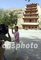 6月13日,鳳凰衛視主持曾靜漪在“萬里行”車隊特殊“申奧日”制作節目,向世界傳播中國申奧的聲音。中新社圖 魏孝明 攝