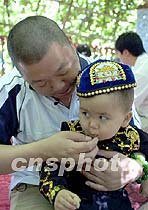 圖:維吾爾“小帥哥”試與臧天朔比“酷” 2001年06月17日 10:04 ![]() 歌星臧天朔6月16日在吐魯番葡萄溝里喜逢“對手”,一位維吾爾“小帥哥”試與歌星比“酷”。圖為老臧抱起“小帥哥”又親又逗。中新社圖 魏孝明 攝
