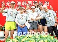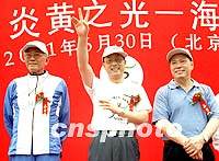 ![]() 臺灣著名運動員吳道源、彭宏年、王瀚、陳怡安、裘海正等30日在北京參加海峽兩岸為北京申奧助威長跑活動時,興奮地高呼:北京·申奧·成功。中新社記者 趙振清 攝
